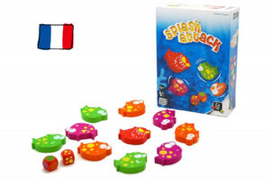 フランス、Gigamic(ギガミック)社のスプラッシュ・アタックは、3種類の色と3種類の形が描かれた9匹の魚を、サイコロに従って素早く獲得していくゲームです。
