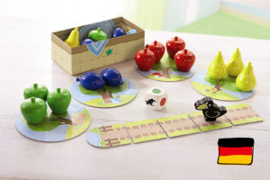 ドイツのHABA社が発売している果樹園ゲーム。プレイヤー同士で競い合うものではなく、プレイヤー全員とカラスの競争を楽しむゲームです。つまり、ひとりだけ負けてしまうということもありません。みんなで楽しく協力してたくさんの果物を獲得します。
